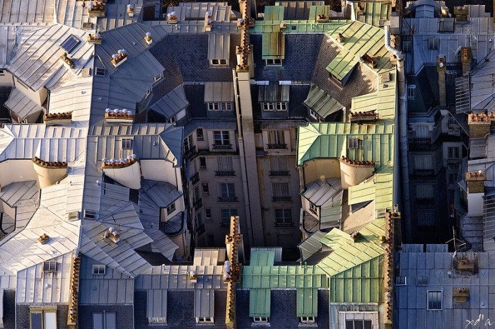 Se rendre à la rue François MironZinc (gris clair) se distingue de l’ardoise (gris foncé). Les toits verts sont en cuivre. Xavier D’Abrigeon