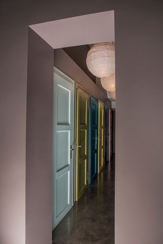 Au lieu de subir la multiplication des ouvertures, on en fait un fil conducteur déco. Un couloir autrefois monotone devient ainsi une galerie colorée qui ne laisse pas indifférent.